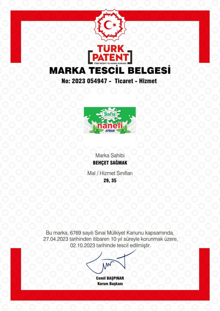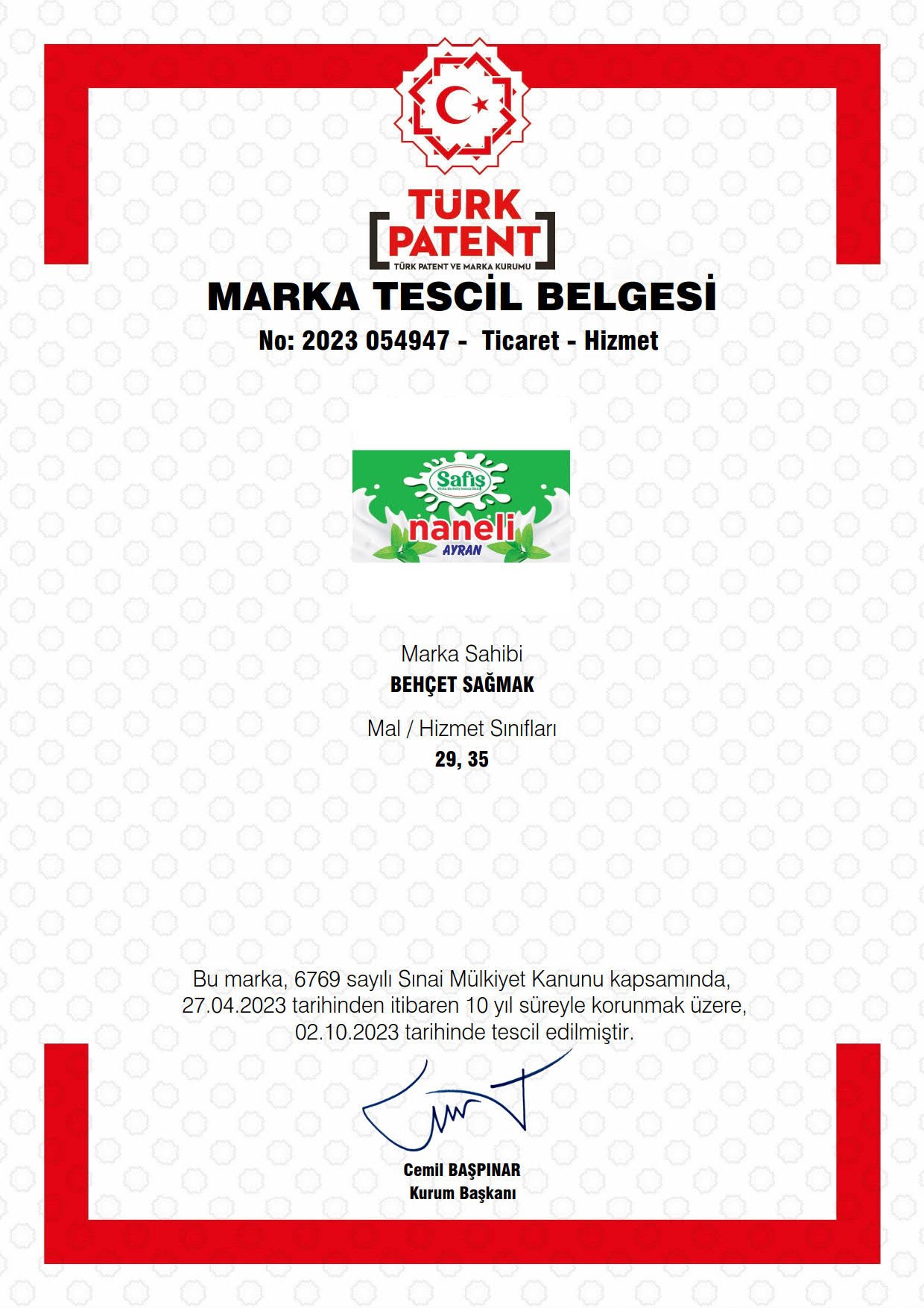 NANELİ AYRAN MARKA TESCİL BELGESİ